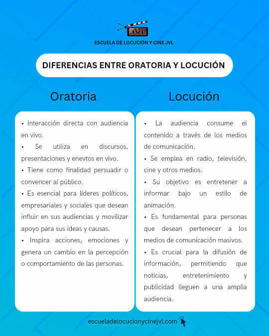 Por otro lado, la locución se refiere al arte de comunicarse a través de medios de comunicación, como la radio, la televisión o el cine, pero bajo un estilo de animación, con el propósito principal de informar y al mismo tiempo entretener. Los locutores son responsables de transmitir información de manera precisa y atractiva, utilizando únicamente su voz como herramienta principal. Mientras que en la oratoria el cuerpo es parte fundamental de la comunicación, en la locución todo depende de la calidad de la voz.