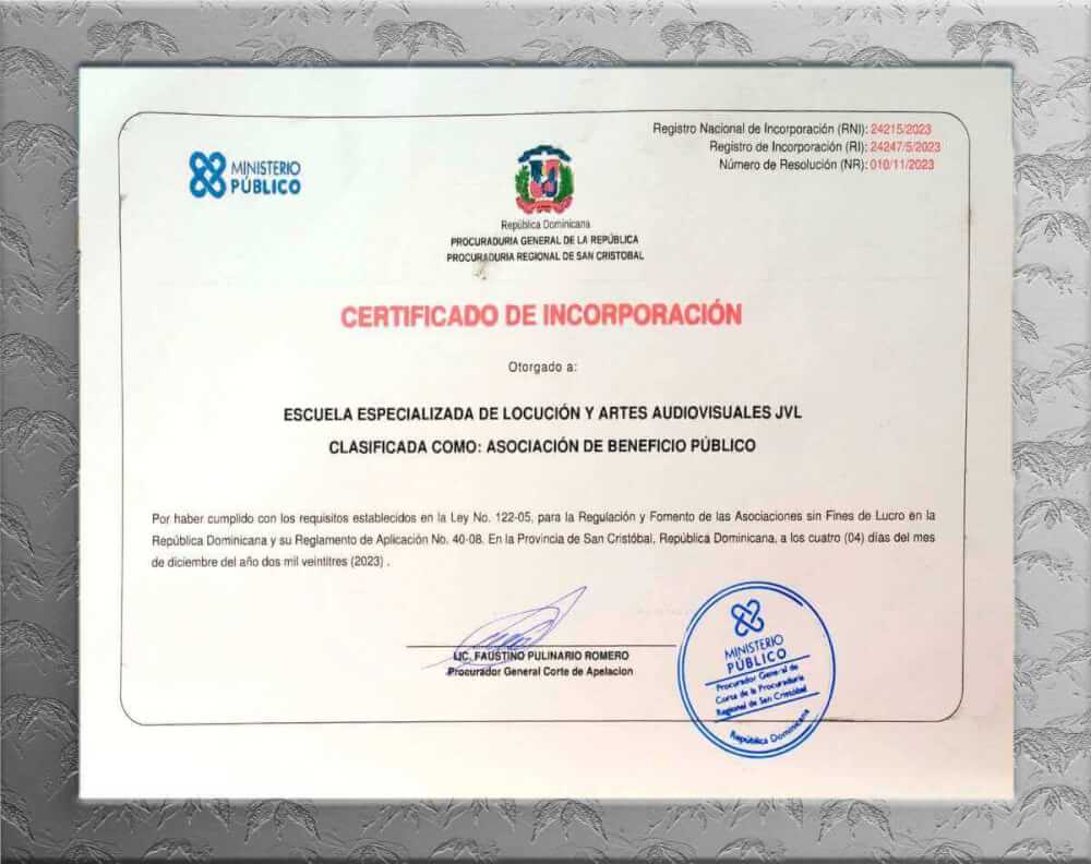 La Escuela de Locución y Cine JVL, una organización sin fines de lucro con más de una década de experiencia en la formación de profesionales en el ámbito de la locución, oratoria y cine, ha recibido la certificación de incorporación por parte de la Procuraduría General de la República (PGR) de la República Dominicana.